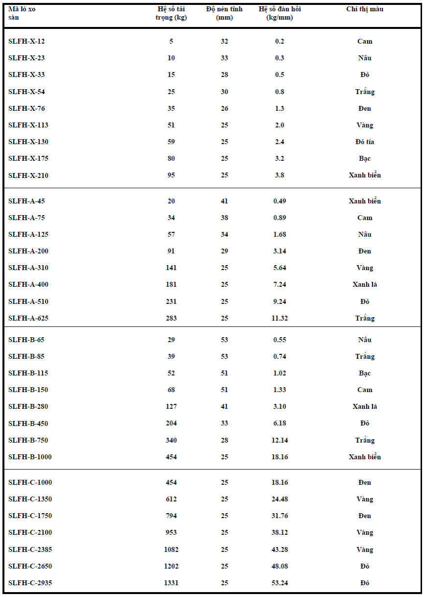 Dưới đây là bảng thông số có độ nén 25mm thường sử dụng