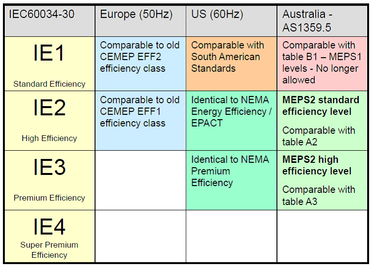 Tiêu chuẩn hiệu suất động cơ tương đương IEC60034-30 với Châu Âu, Mỹ và Úc.