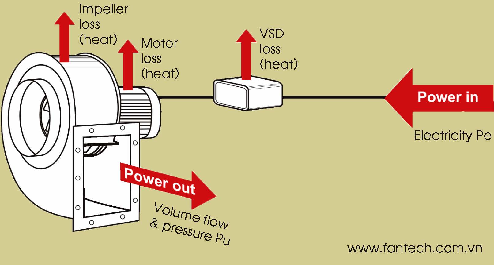 Sơ đồ cho thấy những sự tổn hao công suất điện từ một quạt truyền động gián tiếp qua dây cua roa gồm: