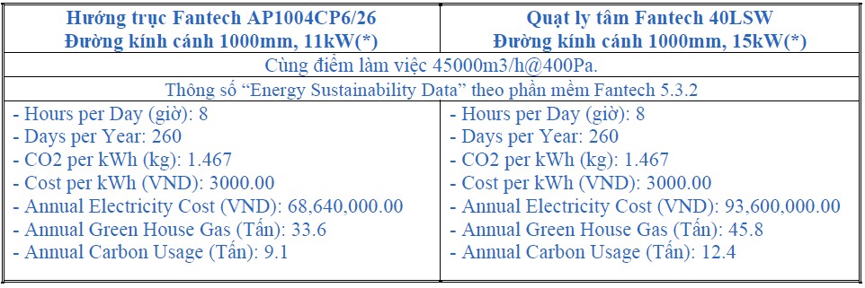 (*) Giả sử công suất tiêu thụ bằng công suất motor được chọn cho mỗi quạt. Số giờ hoạt động có thể thay đổi bằng cách nhập trực tiếp vô phần mềm khi chọn quạt.