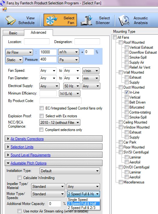 Tương tự trường hợp 1, để chọn quạt bằng phần mềm Fantech. Nhập 45000m3/giờ @ 675Pa và chọn “ 2 Speed Full & 2/3”.