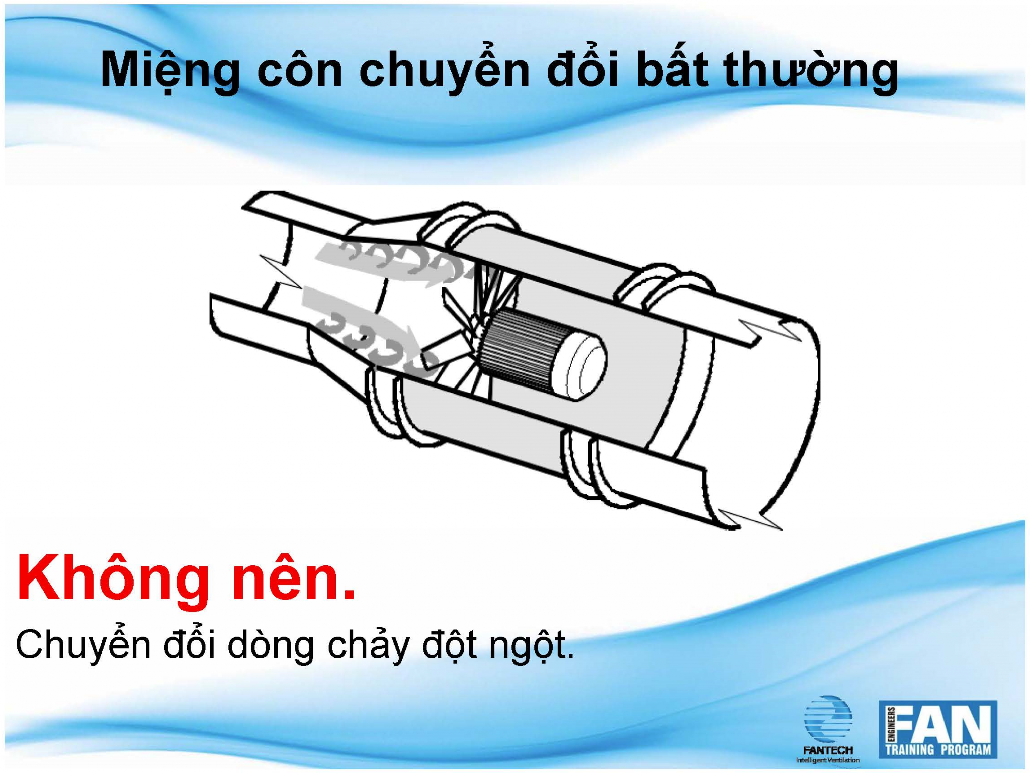 Giả định chúng ta có một quạt được vận hành bởi một động cơ điện với đầu ra 7.5kW, chạy 10 giờ một ngày, 200 ngày mỗi năm. Một động cơ công suất 7,5kW đầu ra đòi hỏi năng lượng đầu vào khoảng 8.3kW (dựa trên qui định hiệu suất tiêu chuẩn MEPS2 @ 90,5%). Nếu 70% năng lượng bị lãng phí, tương ứng bằng 8.3x 0.7 = 5.81kW. Đối với thời gian vận hành quạt nêu ở trên, năng lượng bị lãng phí bằng 11,620kWh hoặc 11,5 tấn khí nhà kính có chứa khoảng 3,1 tấn carbon. Chi phí của năng lượng bị lãng phí và hóa đơn tiền điện phải trả nếu giá điện là VNĐ3,000 cho mỗi kWh qui ra VNĐ34,860,000 mỗi năm. Đối với một quạt hướng trục để sử dụng gần hết năng suất, hoặc phát huy hết khả năng của nó, nó phải có điều kiện kết nối đầu vào và đầu ra hợp lý. Hình 2 là một ví dụ của lắp đặt chấp nhận hơn, cho thấy côn mở rộng và chỗ uốn cong nằm ở một khoảng cách tốt hơn từ vị trí quạt. Các trở lực của hệ thống này sẽ thấp hơn nhiều và quạt hoạt động ổn định và êm hơn.