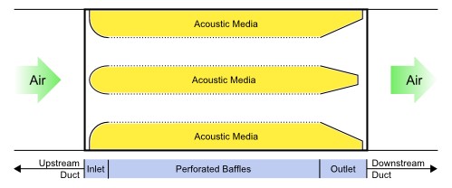 2. Airflow Regenerated Noise: là thông số tiếng ồn tái sinh (or phát sinh thêm) bởi các bộ phận của tiêu âm khi có luồng khí đi qua nó. Tùy thuộc vào số lượng luồng khí đi qua bên trong tiêu âm, nó là sự phản ánh chức năng của vận tốc gió đi qua và hình dạng (khoảng rộng hay hẹp giữa các khe) của bộ tiêu âm. Hiệu quả của insertion loss có thể bị giảm đi bởi kết quả tiếng ồn tái sinh tạo ra bởi luồng khí.