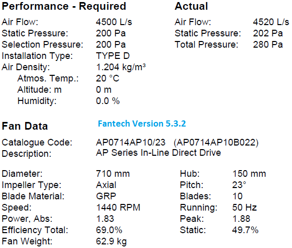 Quạt Fantech model: AP0714AP10/23, chiều quạt thuận là 4500 L/s @ 200Pa, thông số như sau: