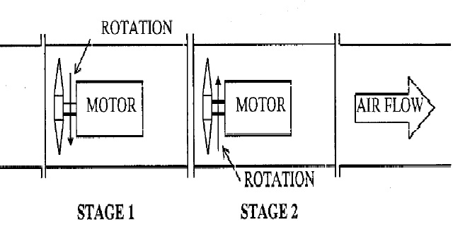 Nhưng nếu hai quạt hướng trục nối tiếp thông thường sẽ dẫn đến việc nhiễu động luồng khí rất cao sinh ra từ quạt thứ nhất sang quạt thứ hai.